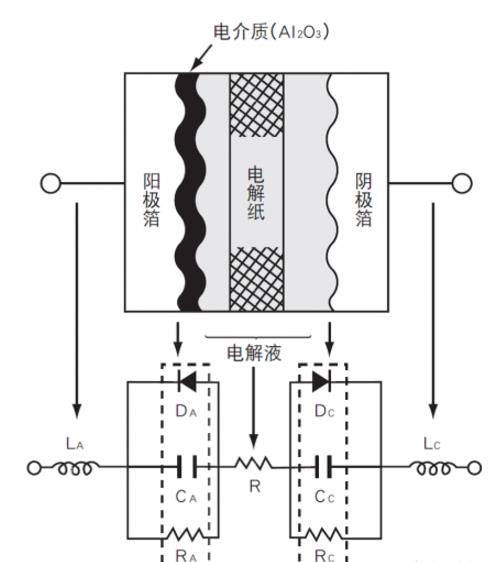 電容的等效電路作為鋁電解電容的電介質(zhì)氧化膜(Al2O3)的介電常數(shù)通常為8~10,這個(gè)值并不比其他類(lèi)型的電容大,但是,通過(guò)對(duì)鋁箔進(jìn)行蝕刻擴(kuò)大表面積,并使用電化學(xué)的處理得到更薄更耐壓的氧化電介質(zhì)層,使鋁電解電容可以取得比其他電容器更大的單位面積CV值。